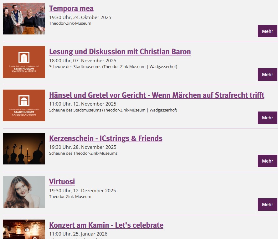 Screenshot des Veranstaltungskalenders des Theodor-Zinks-Museums vom 14.10.2025
